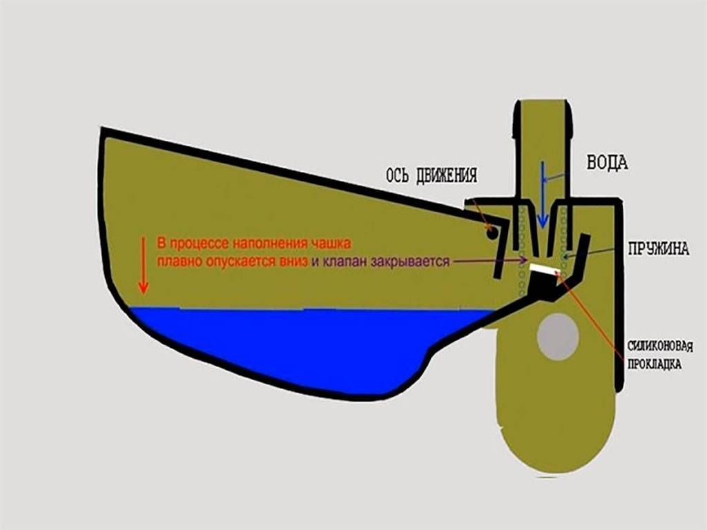 - Приспособление соединяется с водопроводом. Чаша играет роль поплавка. Регулировка подачи воды осуществляется специальным стержнем.