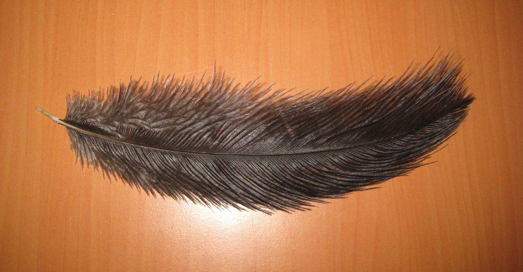 - Овальное туловище покрыто длинными тёмно-бурыми перьями, голова и шея – кучерявыми и короткими;