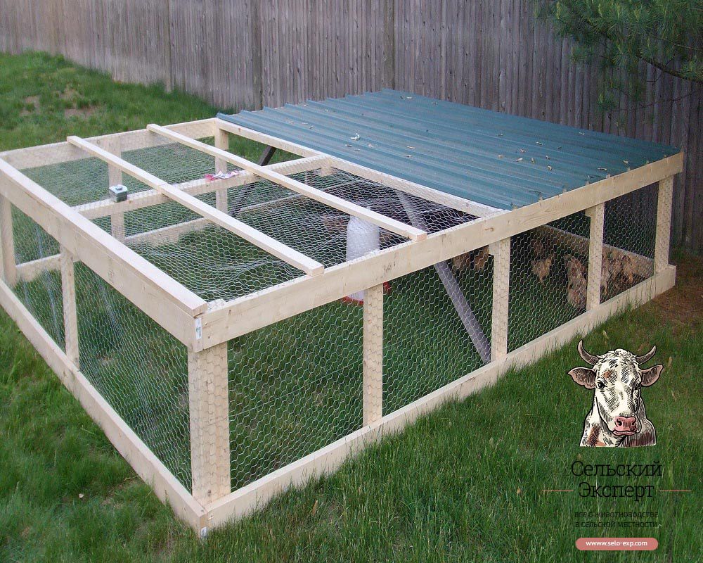 У мобильного вольера есть свои достоинства и недостатки. Объемный выгул для кур трудно перемещать, поэтому передвижные загоны делают маленькими, а подходят они либо для цыплят, либо для малочисленного поголовья кур. Зато такое решение позволяет обеспечивать птиц свежей травкой в летний сезон, так как его можно перемещать при необходимости.