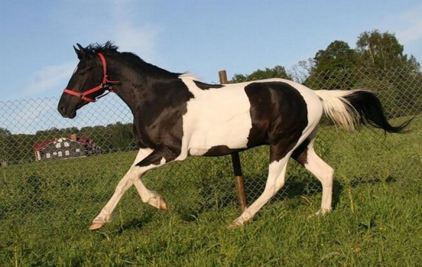 Лошади, которые имеют два и более цветов за счет имеющихся пятен называются пинто. На фоне основного окраса разбросаны крупные пятна. В зависимости от размера и места нахождения этих пятен выделяют разные типы пегости. В Америке такие лошади особенно ценятся и раньше разводились исключительно индейцами. Здесь они получили отдельное название «пинто», что часто путается с породой. Пинто – это все пегие лошади, как на фото черный жеребец с белыми пятнами. |