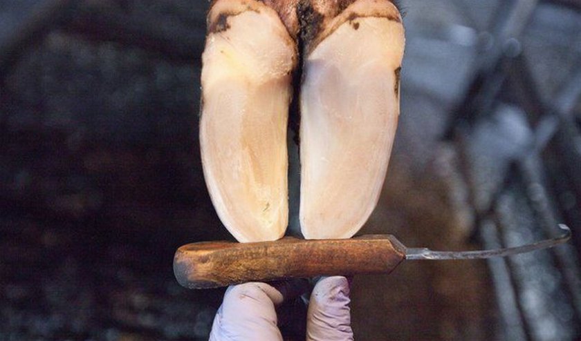 - Обрезку копыта нужно производить до тех пор, пока не покажется белый цвет, это значит, что ороговевший слой полностью срезан.