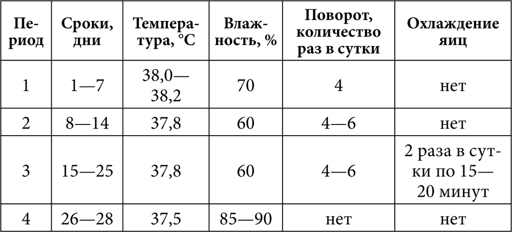 | Период инкубации | Дни | Температура | Влажность | Поворот | Охлаждение |